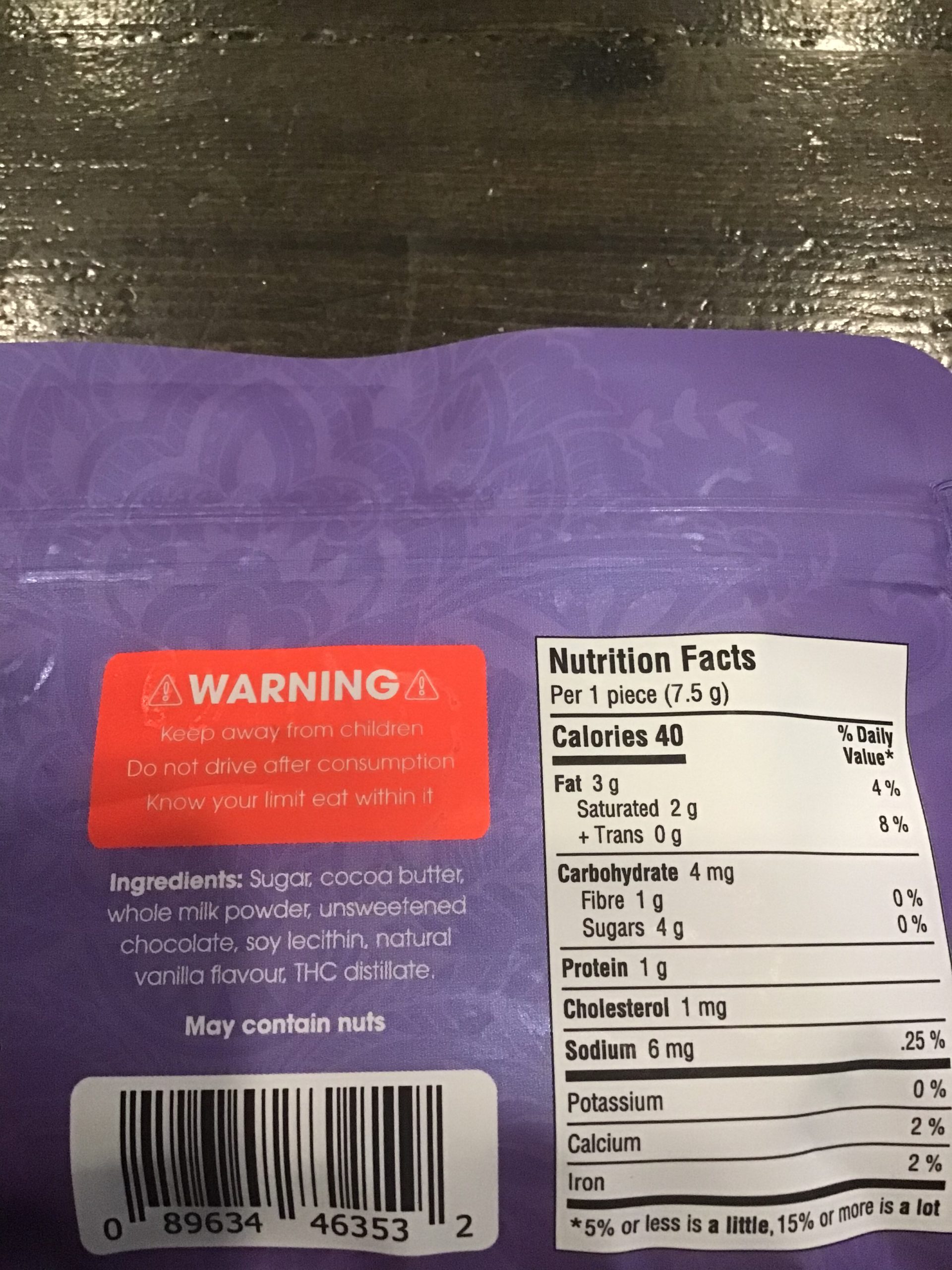 Ingredients: Sugar, cocoa butter, whole milk powder, unsweetened chocolate, soy lecithin, natural vanilla flavour, THC Distillate.